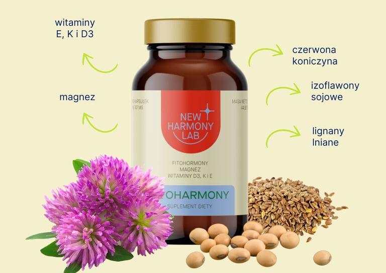 Badania sugerują, że izoflawony oraz fitoestrogeny – związki roślinne o działaniu podobnym do estrogenów – mogą być szczególnie pomocne w okresie okołomenopauzalnym . Znajdują się one m.in. w soi, siemieniu lnianym, czerwonej koniczynie, a ich regularne spożycie może pomóc w łagodzeniu uderzeń gorąca, wspierać zdrowie kości i serca, czy wesprzeć nas w walce z otyłością brzuszną. To właśnie te doniesienia stoją za tym, że nasi eksperci uznali izoflawony i fitohormony za cenny naturalny składnik suplementu, który wspiera dietę kobiet w okresie okołomenopauzalnym .
